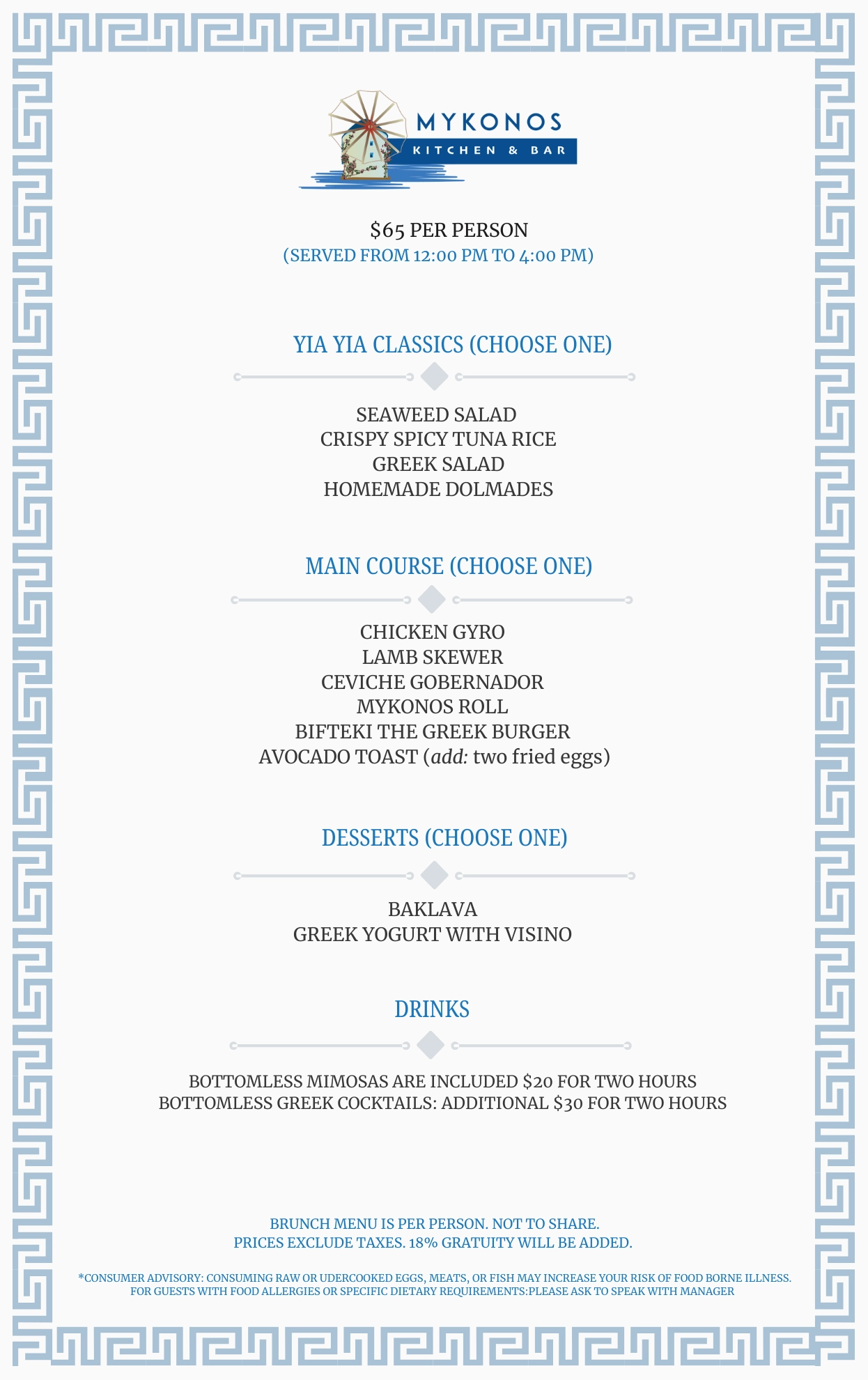 Make your Sundays unforgettable with the Sunday Buffet Brunch at Mykonos Kitchen & Bar in Sunny Isles Beach. From 12:00 PM to 4:00 PM, indulge in a flavorful journey through authentic Greek and Mediterranean cuisine, featuring a carefully curated selection of brunch favorites and regional specialties.
