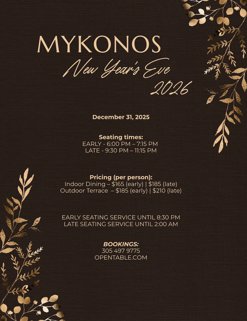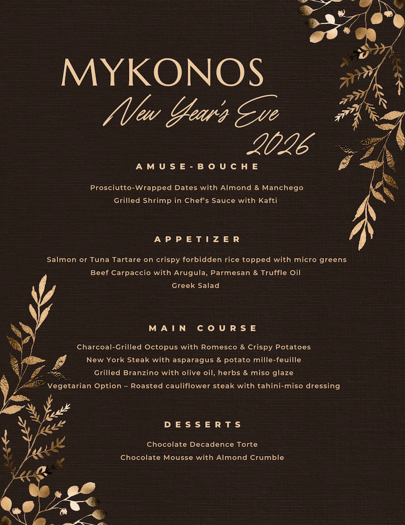Celebrate with us and make this New Year’s Eve at Mykonos Kitchen & Bar one to remember - filled with elegant dining, live music, and the sparkle of the sea.